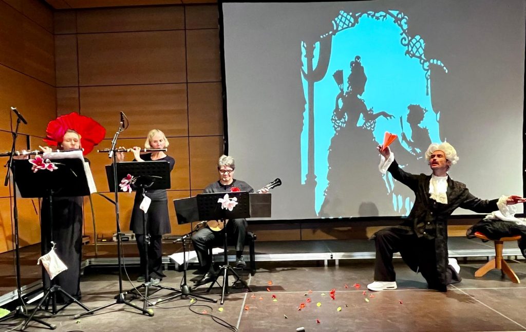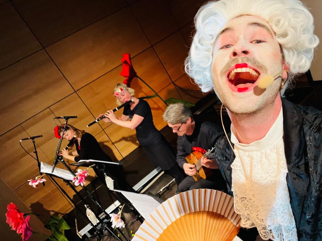 Bei unserer Aufführung handelt es sich sicher auch um ein Konzert, aber nicht nur… Die Idee zu diesem Projekt entstand aus dem Wunsch heraus, Mozarts komische Oper „Le Nozze di Figaro“ kammermusikalisch aufzuführen. Bereits zur Entstehungszeit der Oper 1785 gab es Bearbeitungen für kleine Besetzungen, damit die Menschen die schönen Arien, die sie in der großen Oper gehört hatten, zuhause nachspielen konnten. Wir nutzen unter anderem eine Ausgabe für zwei Flöten, die 1799 erschien. Allerdings haben wir eine Gitarrenstimme ergänzt und Ouvertüre und Finale selber arrangiert.